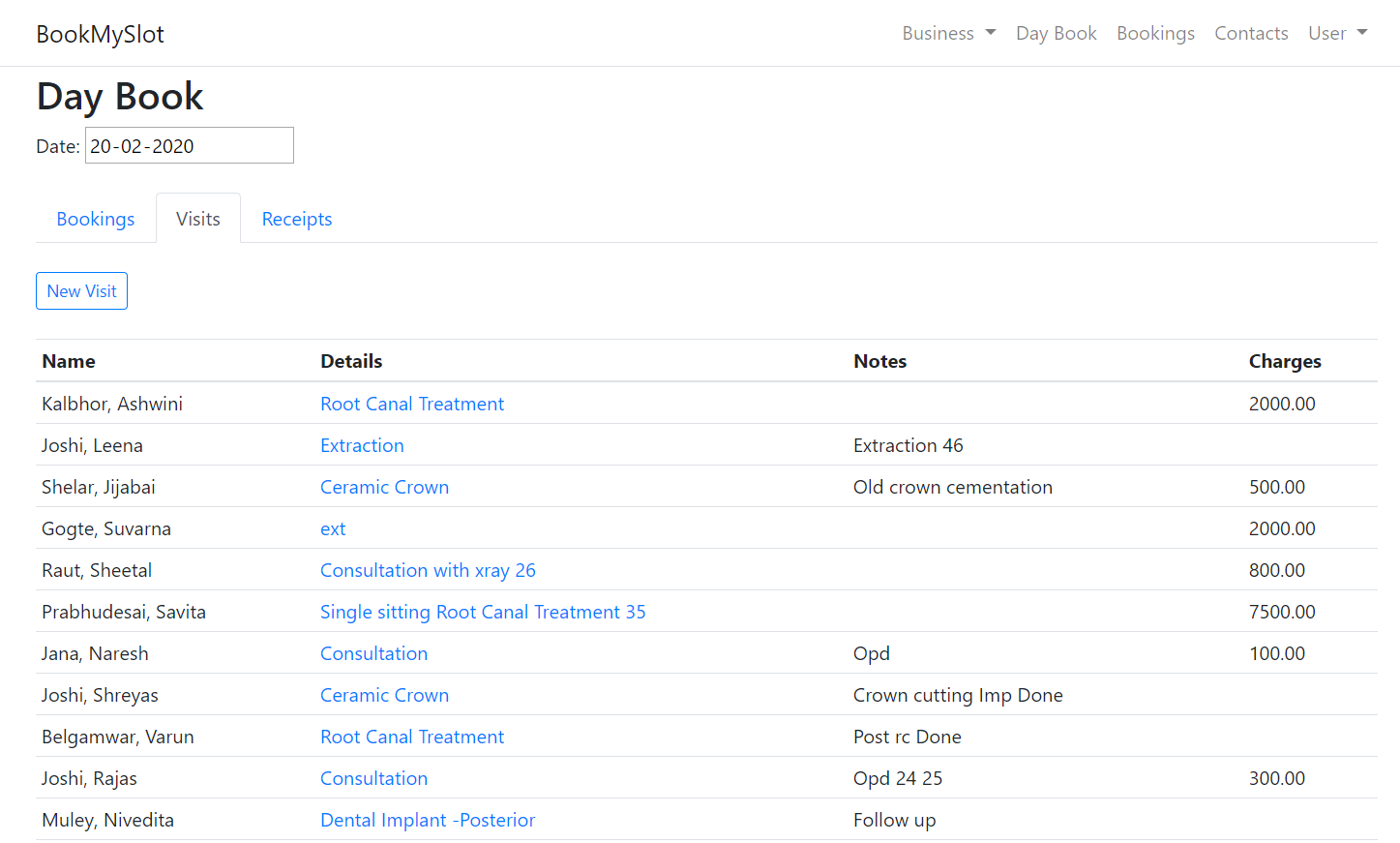Keep track of all customer visits along with the fees charged. See all history for a date or a client.
